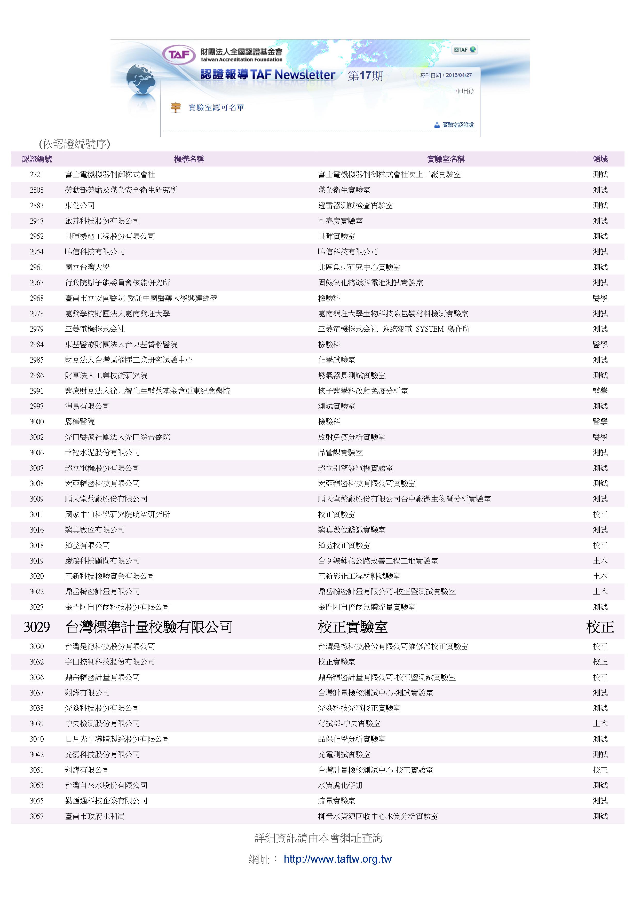 校正實驗室3029 實驗室認可名單,於「認證報導TAF Newsletter 第17期」公告